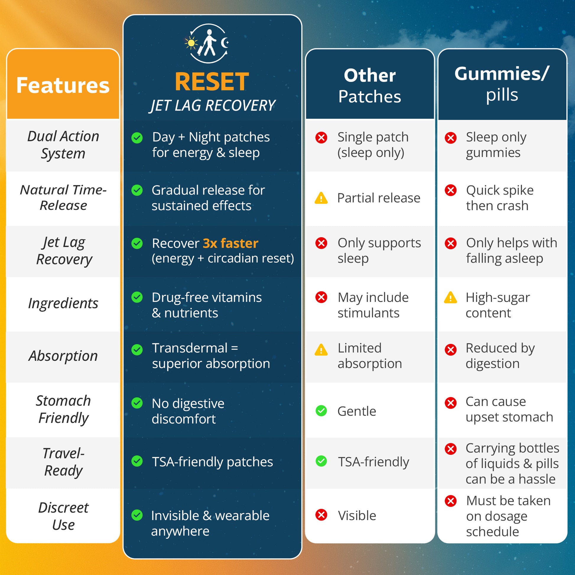 Don’t let jet lag follow you back. Reset helps you realign to your home schedule faster, so you can get back to work or school without the crash.